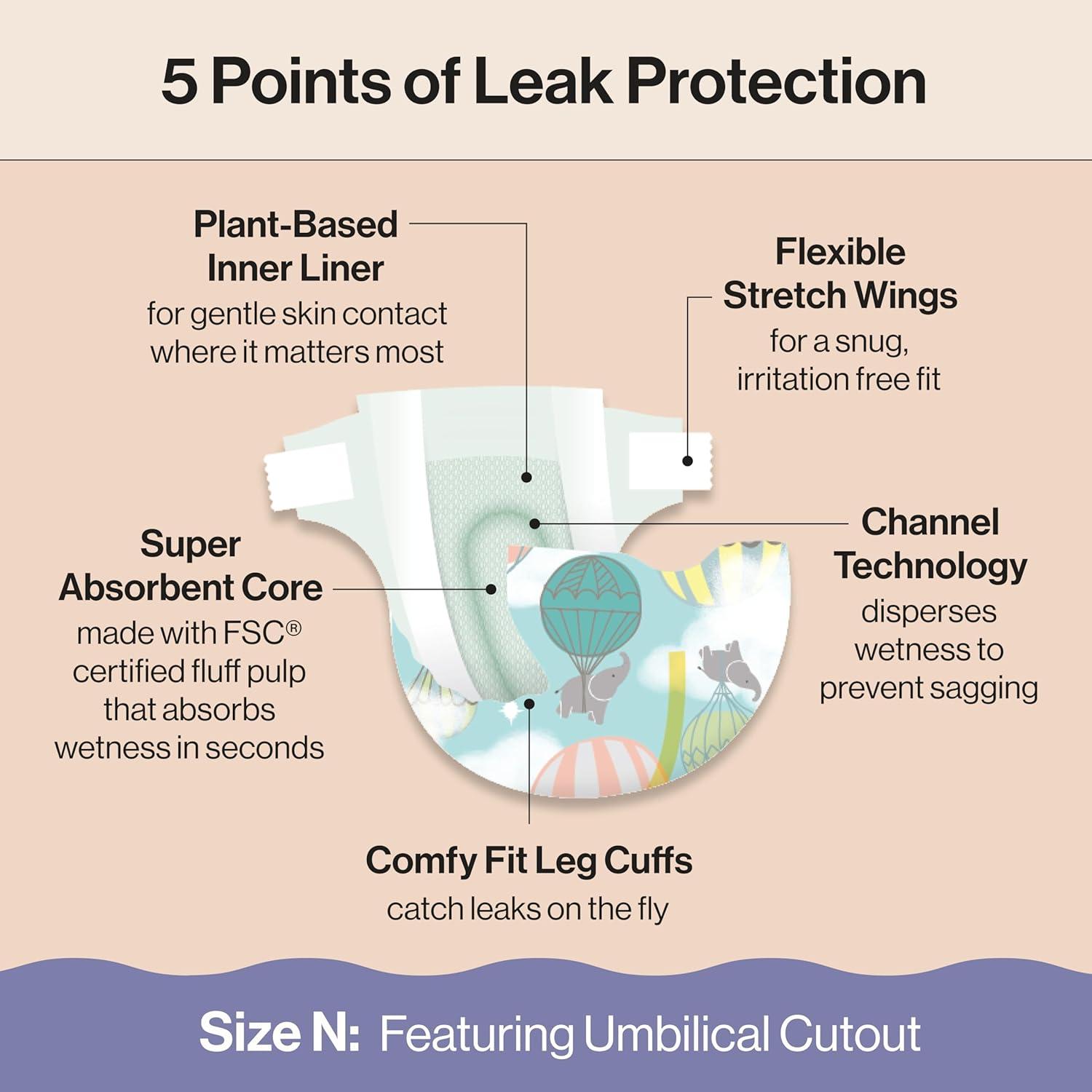 Designed to protect delicate skin, Honest Clean Conscious Diapers keep baby comfortable and dry through all the wiggles and wobbles! Our softest diaper yet delivers up to 100% leak protection with Comfort Dry Technology. The hypoallergenic, plant based inner liner, flexible stretch wings, super absorbent core, and channel technology provide a comfy, secure fit for all ages and stages. Because safety is top priority, these diapers are OEKO-TEX STANDARD 100 Certified, a 3rd party that tests for 350 harmful chemicals, and made with FSC Certified Fluff Pulp and other controlled materials. And for cuteness overload, each diaper features a super cute print!