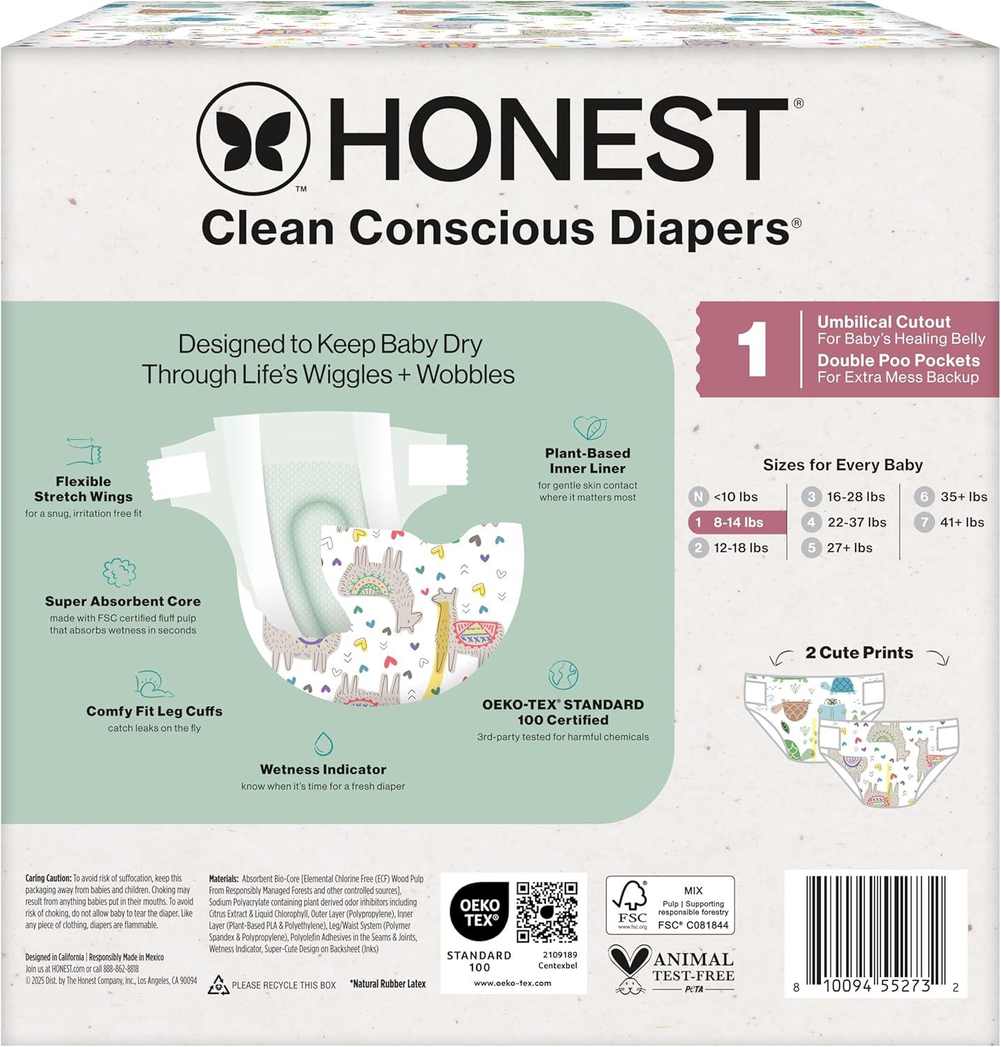 Designed to protect delicate skin, Honest Clean Conscious Diapers keep baby comfortable and dry through all the wiggles and wobbles! Our softest diaper yet delivers up to 100% leak protection with Comfort Dry Technology. The hypoallergenic, plant based inner liner, flexible stretch wings, super absorbent core, and channel technology provide a comfy, secure fit for all ages and stages. Because safety is top priority, these diapers are OEKO-TEX STANDARD 100 Certified, a 3rd party that tests for 350 harmful chemicals, and made with FSC Certified Fluff Pulp and other controlled materials. And for cuteness overload, each diaper features a super cute print!