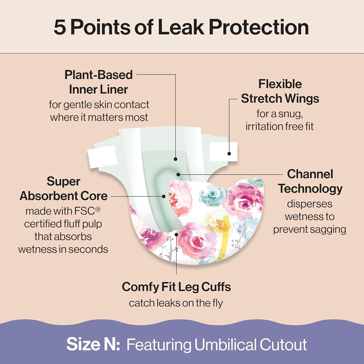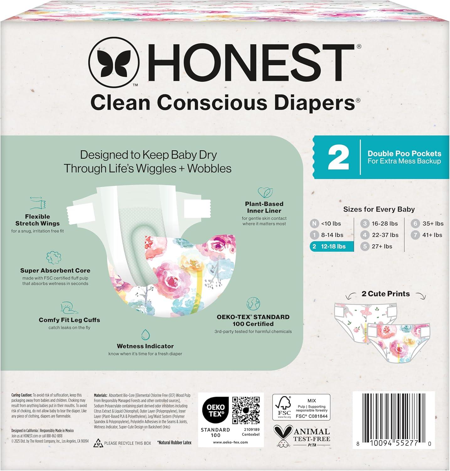 Designed to protect delicate skin, Honest Clean Conscious Diapers keep baby comfortable and dry through all the wiggles and wobbles! Our softest diaper yet delivers up to 100% leak protection with Comfort Dry Technology. The hypoallergenic, plant based inner liner, flexible stretch wings, super absorbent core, and channel technology provide a comfy, secure fit for all ages and stages. Because safety is top priority, these diapers are OEKO-TEX STANDARD 100 Certified, a 3rd party that tests for 350 harmful chemicals, and made with FSC Certified Fluff Pulp and other controlled materials. And for cuteness overload, each diaper features a super cute print!