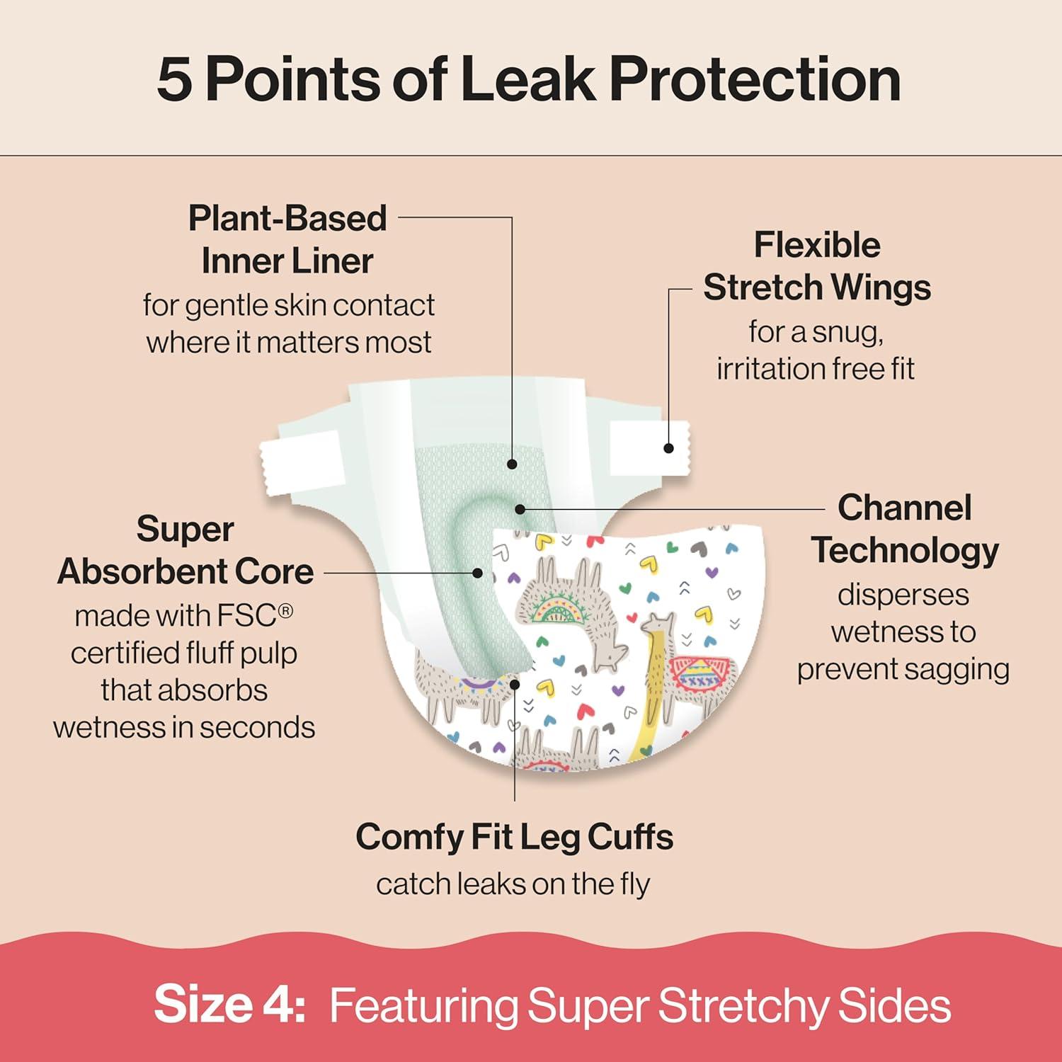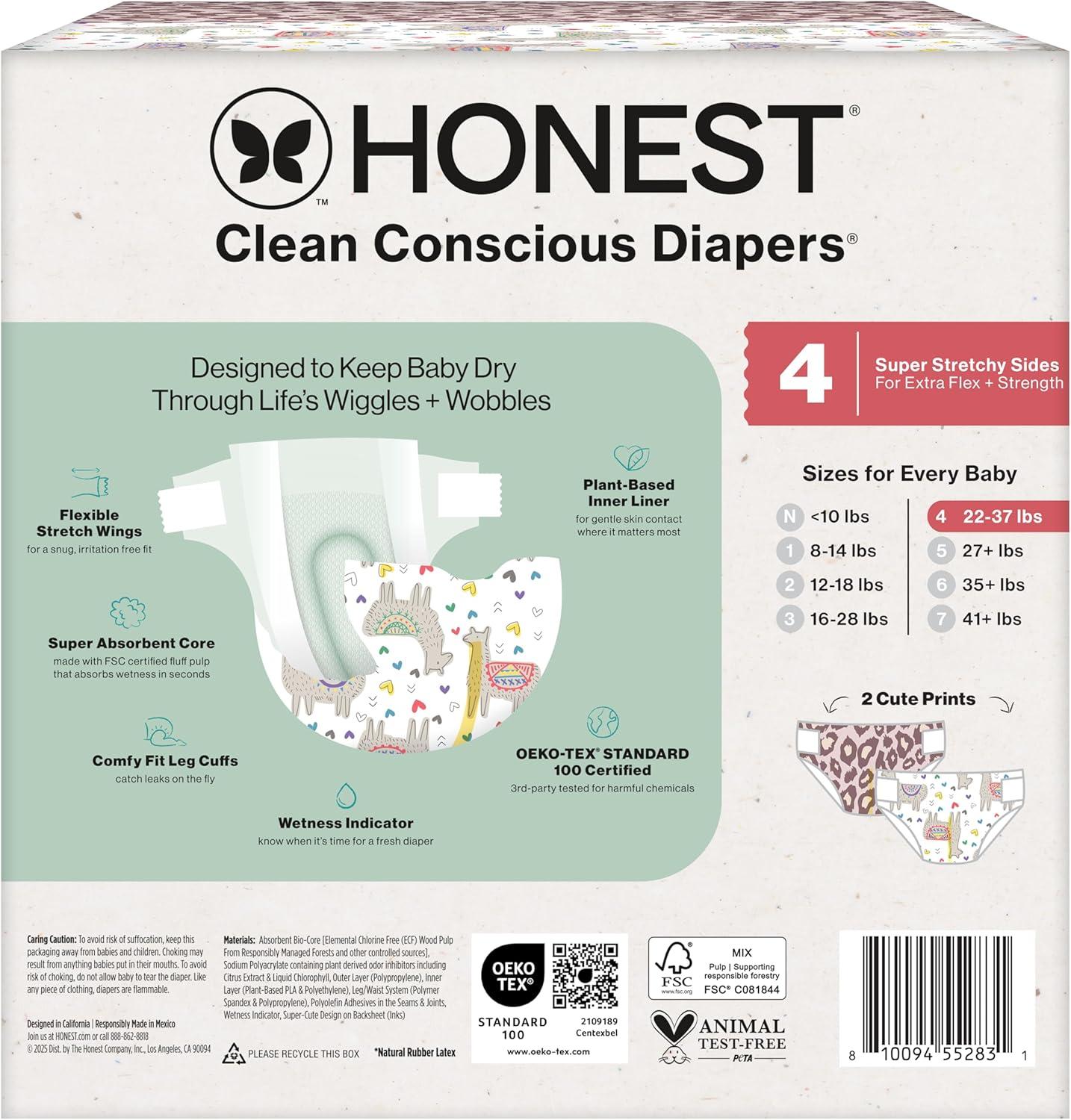 Designed to protect delicate skin, Honest Clean Conscious Diapers keep baby comfortable and dry through all the wiggles and wobbles! Our softest diaper yet delivers up to 100% leak protection with Comfort Dry Technology. The hypoallergenic, plant based inner liner, flexible stretch wings, super absorbent core, and channel technology provide a comfy, secure fit for all ages and stages. Because safety is top priority, these diapers are OEKO-TEX STANDARD 100 Certified, a 3rd party that tests for 350 harmful chemicals, and made with FSC Certified Fluff Pulp and other controlled materials. And for cuteness overload, each diaper features a super cute print!