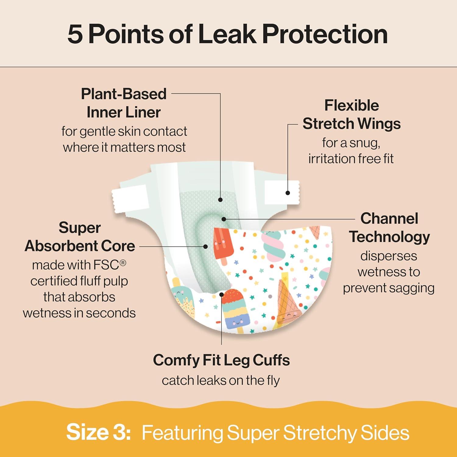 OUR BEST FIT YET: Designed to move with your baby, Honest Clean Conscious Diapers feature comfy fit leg cuffs to catch leaks on the fly and flexible, stretchy wings that provide a snug, irritation-free fit. The super cute prints are an added bonus