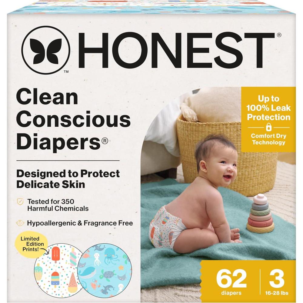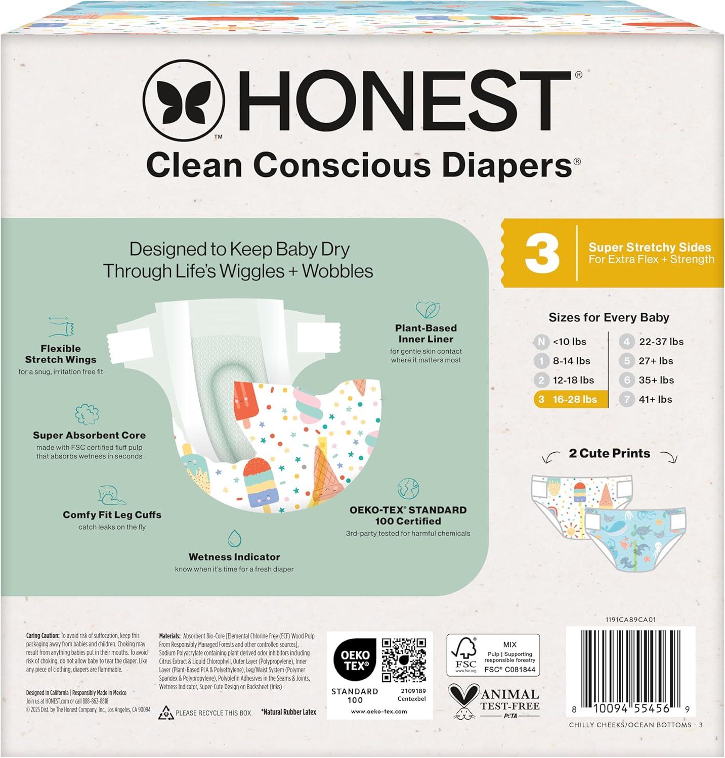 Designed to protect delicate skin, Honest Clean Conscious Diapers keep baby comfortable and dry through all the wiggles and wobbles! Our softest diaper yet delivers up to 100% leak protection with Comfort Dry Technology. The hypoallergenic, plant based inner liner, flexible stretch wings, super absorbent core, and channel technology provide a comfy, secure fit for all ages and stages. Because safety is top priority, these diapers are OEKO-TEX STANDARD 100 Certified, a 3rd party that tests for 350 harmful chemicals, and made with FSC Certified Fluff Pulp and other controlled materials. And for cuteness overload, each diaper features a super cute print!