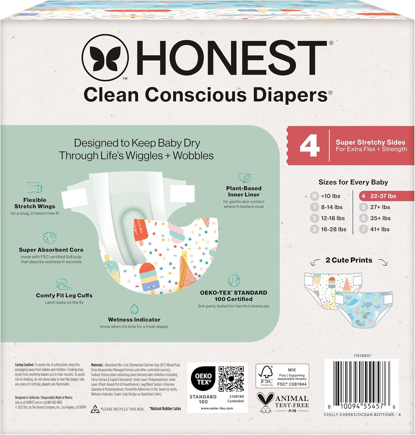 Designed to protect delicate skin, Honest Clean Conscious Diapers keep baby comfortable and dry through all the wiggles and wobbles! Our softest diaper yet delivers up to 100% leak protection with Comfort Dry Technology. The hypoallergenic, plant based inner liner, flexible stretch wings, super absorbent core, and channel technology provide a comfy, secure fit for all ages and stages. Because safety is top priority, these diapers are OEKO-TEX STANDARD 100 Certified, a 3rd party that tests for 350 harmful chemicals, and made with FSC Certified Fluff Pulp and other controlled materials. And for cuteness overload, each diaper features a super cute print!