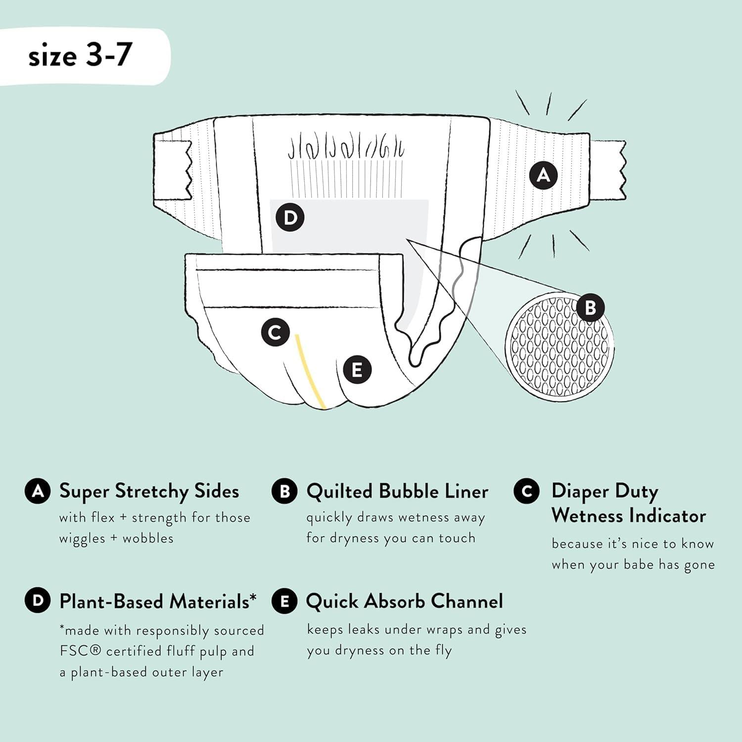 Our most earth conscious Diapers yet made with a plant-based backsheet, advanced absorption, enhanced blowout protection, a wetness indicator for less guessing, hypoallergenic inner lining, cloud-like comfort fit and free of latex, fragrance, and parabens