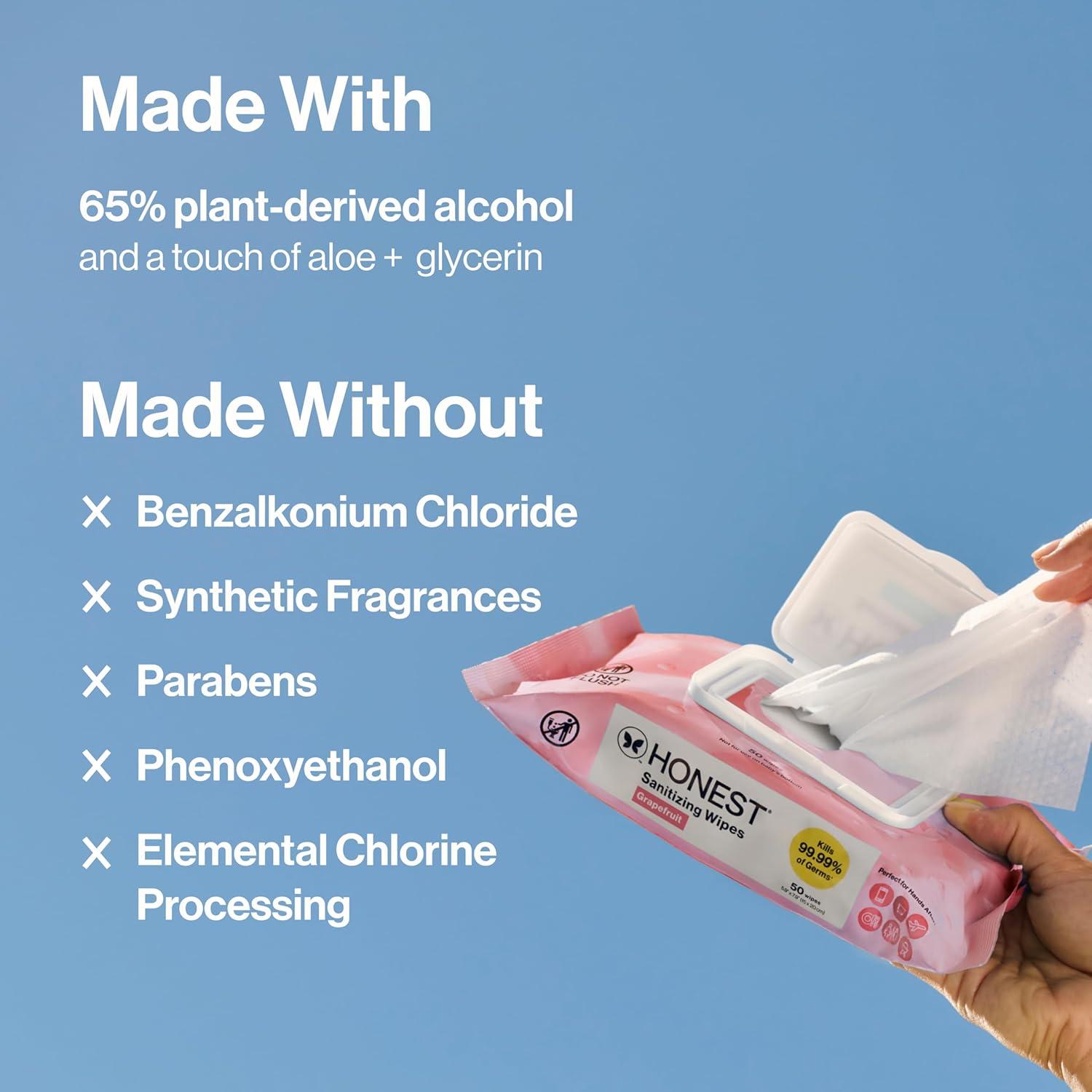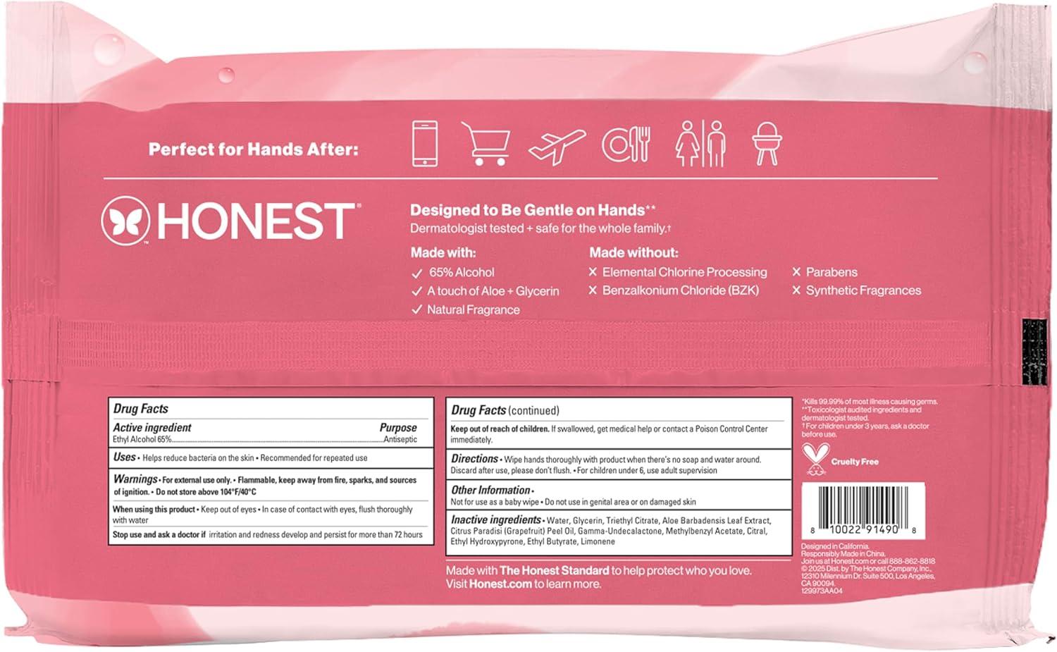 MADE WITH: Sanitizing wipe crafted with 65% Alcohol and a touch of aloe + glycerin, and natural fragrance.